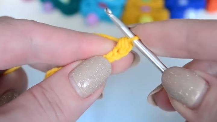 Наберите цепочку из 75 воздушных петель (ВП). Сделайте накид. Вставьте крючок во 2-ую петлю от конца. Провяжите полустолбик с накидом.