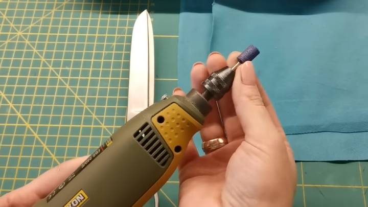 Нужно включить дрель (примерно на 9 тыс. оборотов) и проводить насадкой без нажима от центра к краю лезвия ровно по заводской заточке. Повторите так около 20 раз, затем переверните ножницы и сделайте то же самое на второй половине.