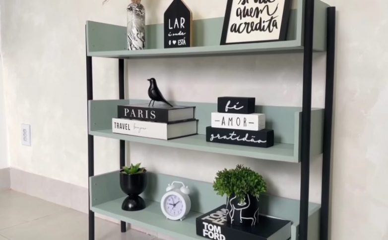 Сделать ножки для будущего стеллажа можно, используя деревянные рейки с круглым сечением или даже деревянные ручки от старых швабр. Покрасьте ножки краской выбранного цвета и оставьте до полного высыхания.