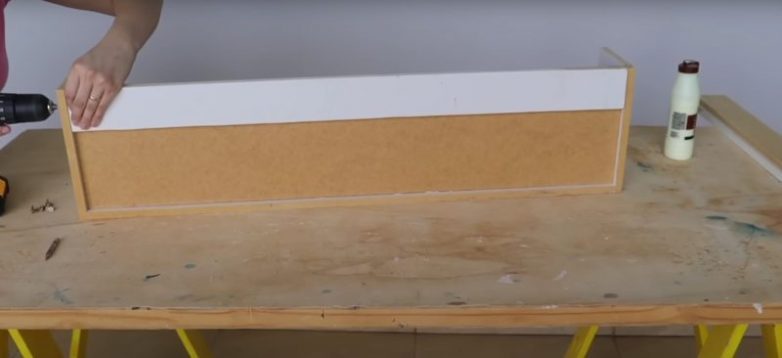 В этом проекте задняя стенка ящика, которая обычно делается из тонкой фанеры, становится нижней частью полки стеллажа. Поэтому эту часть следует дополнительно укрепить с помощью деревянной планки. Планки можно изготовить из оставшейся половины ящика.