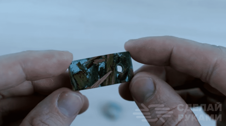 Приготовим щепочки, поместим часть из них в форму и зальем смолой. Оставшуюся часть добавим сверху. Оставляем затвердевать примерно на сутки. Убедившись, что эпоксидка застыла, снимаем скотч. Делаем эскиз и по нему выпиливаем кольцо и кулон, предварительно разделив заготовку на две части.