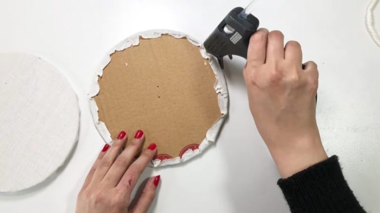 Склейте между собой два круга из плотного картона и обтяните заготовку тканью. Подготовьте еще одну круглую заготовку из картона, обтянутую тканью. Соедините детали между собой — это будет дно будущей корзины.