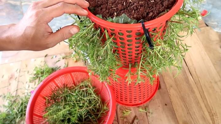В качестве подвесного кашпо используйте пластиковые корзины или вёдра с отверстиями. Их также можно сделать самостоятельно при помощи паяльника.