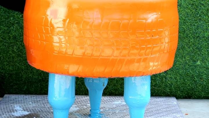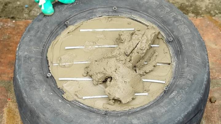 Пластиковые бутылки разрежьте пополам. Верхнюю половинку с горлышком наполните раствором. Установите 3 шт. на покрышку. По центру сделайте отверстие для слива лишней воды.