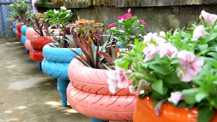 Если у вас имеются старые покрышки, приспособьте их на участке! Сделайте оригинальные вазоны на ножках. Смотрятся необычно и стильно! Настоящая красота для участка на бюджете.