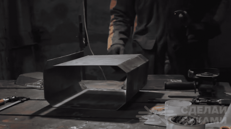 Отрезаем заготовки необходимых размеров, после чего размечаем и делаем пропилы при помощи болгарки. После этого сгибаем металл и дополнительно провариваем места сгиба. Конечно, согнуть детали проще при помощи листогибочного станка. Однако если его нет под рукой, то выход только такой.