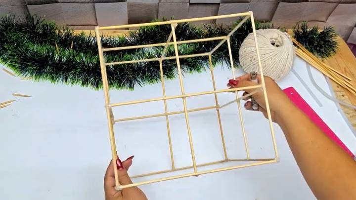 Подготовьте деревянные шампуры. Обрежьте их до длины 25 см. Склейте из них 2 квадрата.