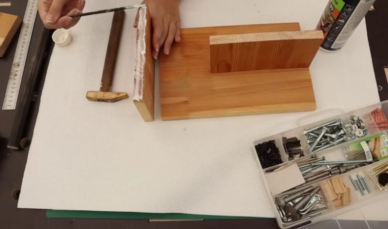 Для фиксации деталей между собой понадобится столярный клей ПВА и тонкие гвозди. Первым шагом зафиксируйте на основании разделители. Далее прикрепите боковые стенки-домики, располагая их по короткой стороне основания.
