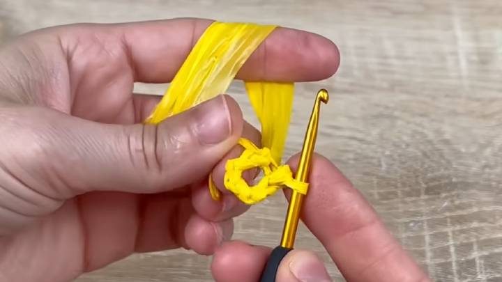 Приступаем к вязанию крючком! Наберите 6 воздушных петель. Замкните цепочку в кольцо: вставьте крючок в первую петлю и закройте соединительным столбиком.