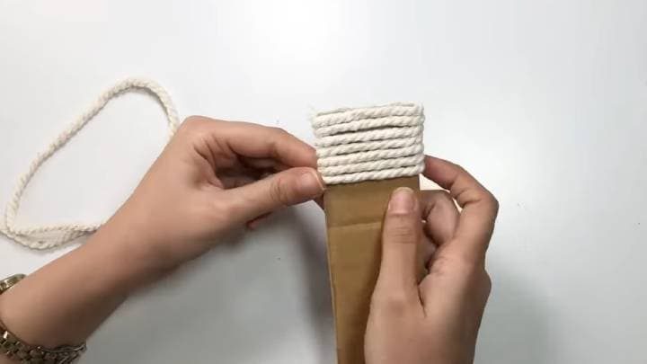 Также вырежьте из картона длинные полоски. Оберните их верёвкой или толстой пряжей.