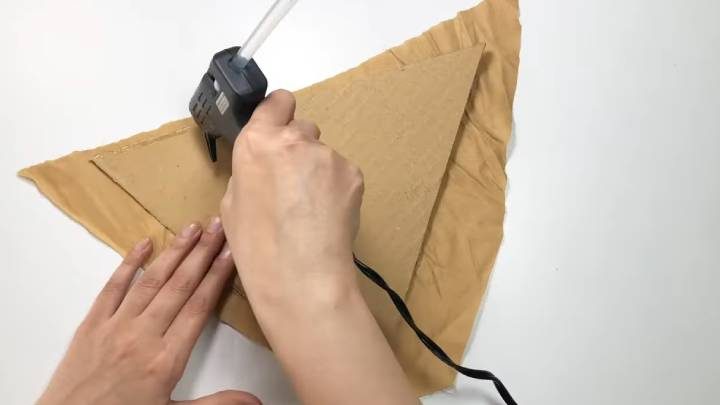 Из картона вырежьте 4 треугольника. Каждый оклейте тканью с одной стороны. Склейте по 2 треугольника вместе.