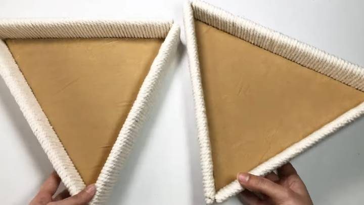 Картонные втулки от фольги/пекарской бумаги оберните верёвкой. Приклейте по углам треугольника.