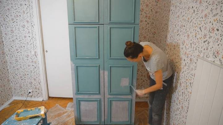 В комнате стоял старенький советский шкаф классического коричневого цвета. Чтобы вписать его в новый интерьер, мастерица зашкурила поверхность и загрунтовала. После этого приклеила на жидкие гвозди молдинги и покрасила всё воедино краской цвета морской волны.