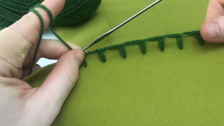 Жилет почти готов! Пройма вырезана. Теперь остаётся только обвязать ткань по всему периметру крючком. Для этого подберите подходящего цвета пряжу. Вставляйте крючок прямо в ткань на одинаковом расстоянии, набирайте 4-5 воздушных петель, снова присоединяйтесь крючком к ткани. Вариантов обвязки ткани — великое множество, а это — лишь один из них.