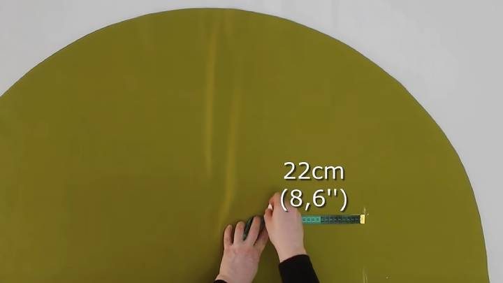 Вырежьте по линии. Раскройте ткань один раз, чтобы она была сложена только вдвое. От края отступите 30 см. От этой точки проведите вверх линию 18 см. Наконец, от неё проведите в бок 22 см (на той же высоте 18 см от низа).