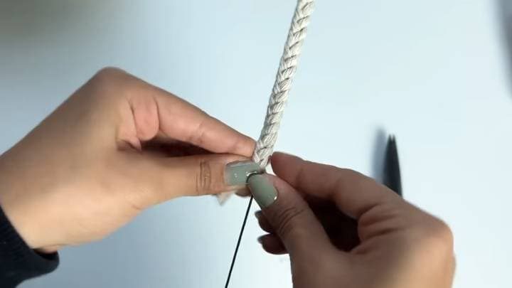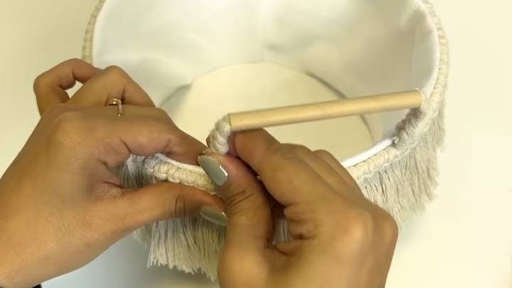 Отрежьте двойной шнур по длине равной окружности ведёрка. На него завяжите отрезки шнура одинаковой длины.