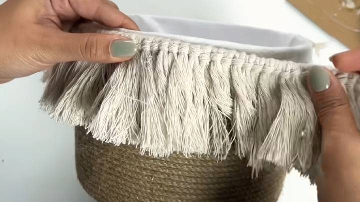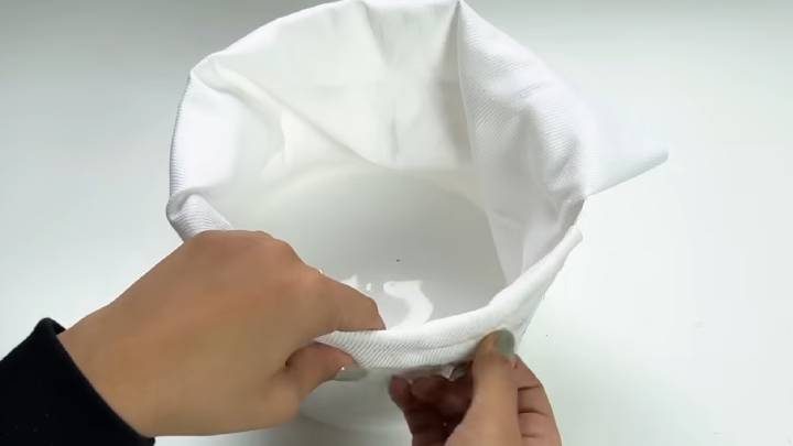 У ведёрка отрежьте ободок с ручкой — он не понадобится. Внутрь выстелите ткань, подверните край, проклейте.