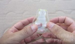 Берем пластиковую крышку от бутылки, заполняем ее термоклеем — делаем мягкую «подушку», на которую и устанавливается маленькая игрушка (размеры должны быть компактными, чтобы игрушка поместилась в лампочку).