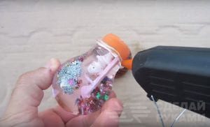 Насыпаем внутрь стеклянного корпуса немного разноцветных звездочек и серебристых блесток, после чего приклеиваем на термоклей пластиковую пробку с игрушкой. Место стыка необходимо дополнительно проклеить суперклеем («Момент» или др.).