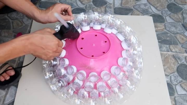 У пластиковых бутылок отрежьте часть с горлышком. Закрутите крышку. В пластиковом тазу сделайте отверстия для слива лишней воды. По кругу снаружи приклейте горлышки от бутылок.Заполняйте ими всё пространство. Добавляйте достаточно горячего клея, чтобы пластик намертво склеился.