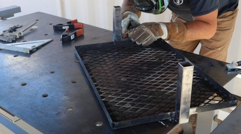Из металлического уголка свариваем прямоугольную раму требуемого размера (на ваше усмотрение) и привариваем к ней стальную решетку. По бокам рамы необходимо будет приварить отрезки профильной трубы.