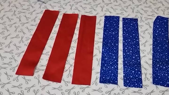 Для второй идеи подготовьте полотенце 33*70 см. Также разрежьте его на две равные части. Ещё понадобятся полоски ткани — 5*25 см, по 3 шт. на каждую половинку полотенца.