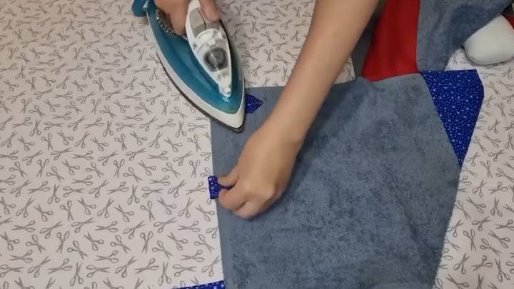 Сложите края к центру, прогладьте утюгом. Прошейте на машинке.