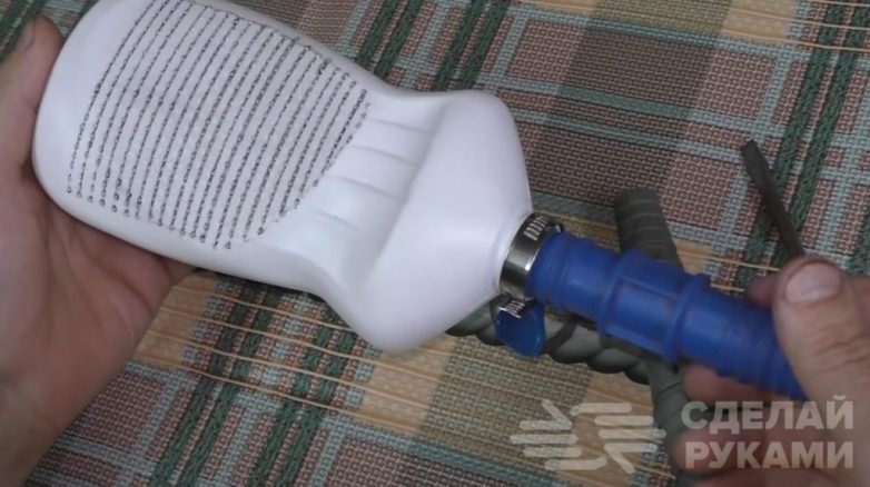 Берем соединительный штуцер и одним концом вставляем его в горлышко бутылки максимально плотно. Затем дополнительно обжимаем место соединения с помощью хомута, который рассчитан на диаметр 20—32 мм.