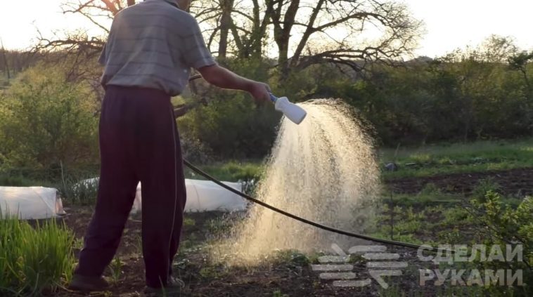В завершении останется только подсоединить самодельную поливалку к поливочному шлангу и можно поливать огород.