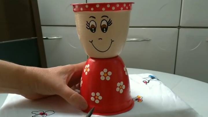 На одной баночке нарисуйте лицо. Вторую декорируйте нарисованными цветочками или другим рисунком.