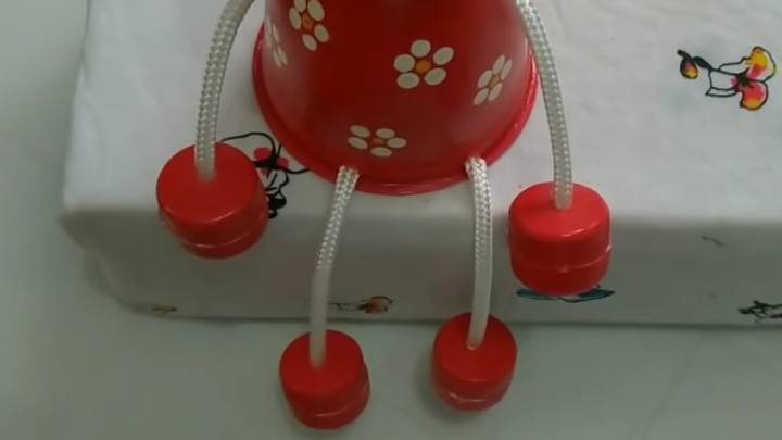 В отверстия вставьте отрезки верёвки или шпагата, завяжите внутри узлом. Снаружи проденьте их в крышки, в которых сделаны отверстия, также завяжите узел внутри.