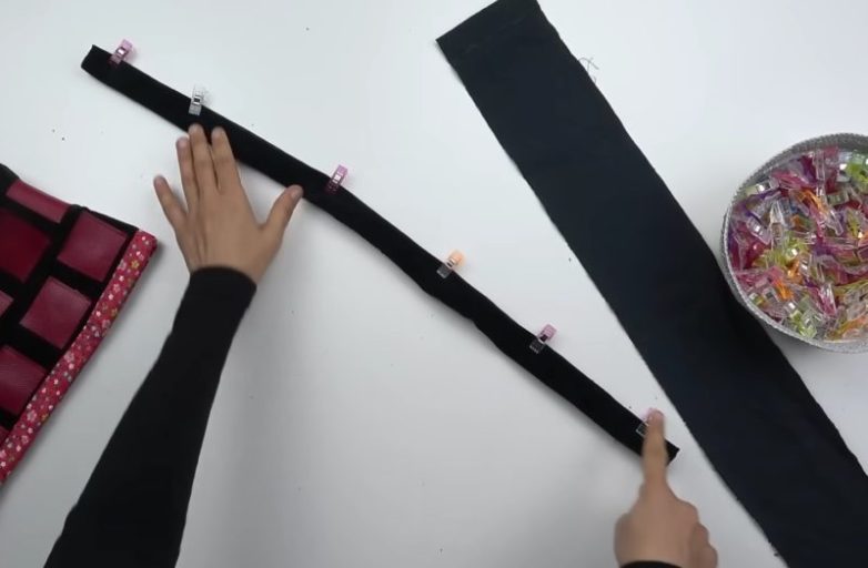 Для изготовления ручек потребуются полосы ткани размером 10 см на 65 см. Сложите полосы в 4 раза и проложите две фиксирующие строчки.