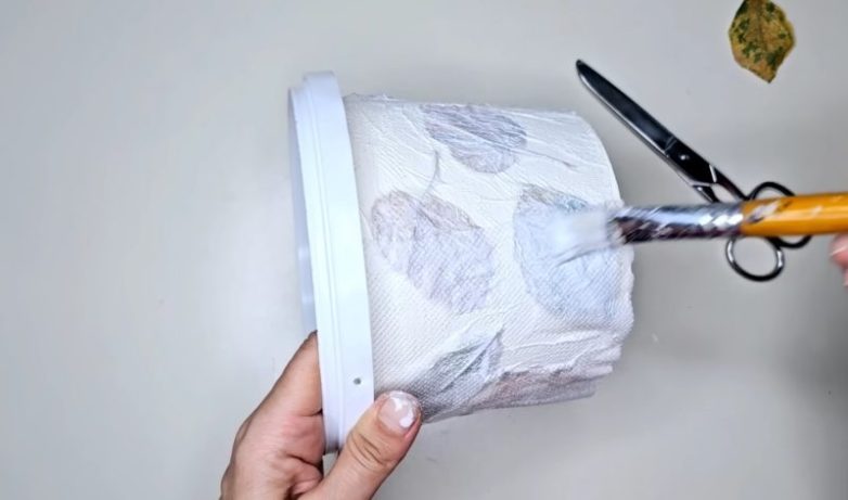 Покройте ведерко слоем акриловой краски белого цвета. Разведите клей ПВА с водой в соотношении 1 к 1. Нанесите клей на ведерко, сверху разместите листочки. Каждый лист сверху покройте клеем.