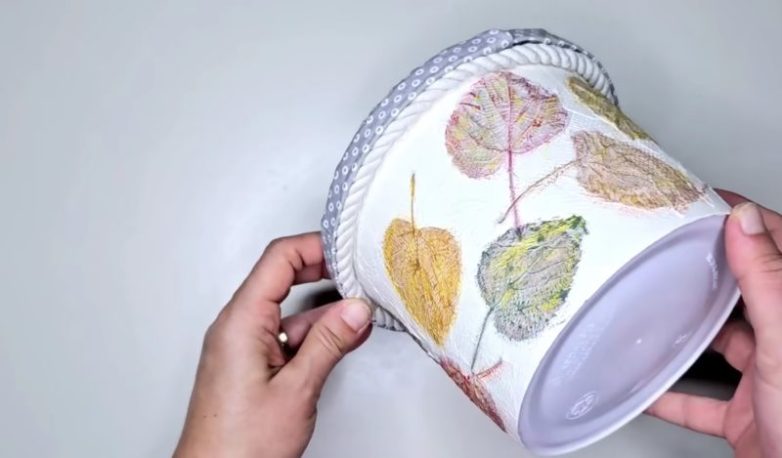 Обычное пластиковое ведерко и опавшие листья с деревьев легко можно превратить в красивую декоративную корзину, которая станет прекрасным дополнением интерьера.