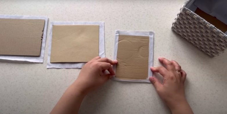 Для оформления внутренней части ящика используйте тонкую хлопчатобумажную ткань подходящего цвета. Чтобы аккуратно оформить дно с внешней и внутренней стороны коробки и крышку с внутренней стороны, обклейте тканью картонные заготовки соответствующего размера.