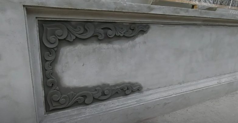 Теперь прикладываем трафарет и обрезаем лишние куски раствора, придавая ему нужную форму. Потом останется только довести орнамент до ума.