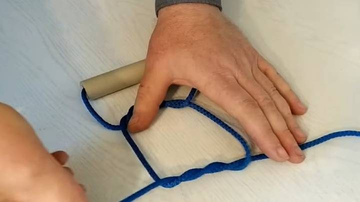 Проденьте шнур через трубу. Завяжите простой узел, а теперь один конец нити перекрутите в одну сторону, а второй — в другую. Немного затяните.