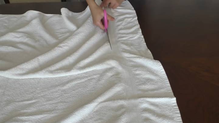 Нарежьте полотенце на полосы около 5 см шириной. Длина может быть любой. Сложите края к центру и совместите.