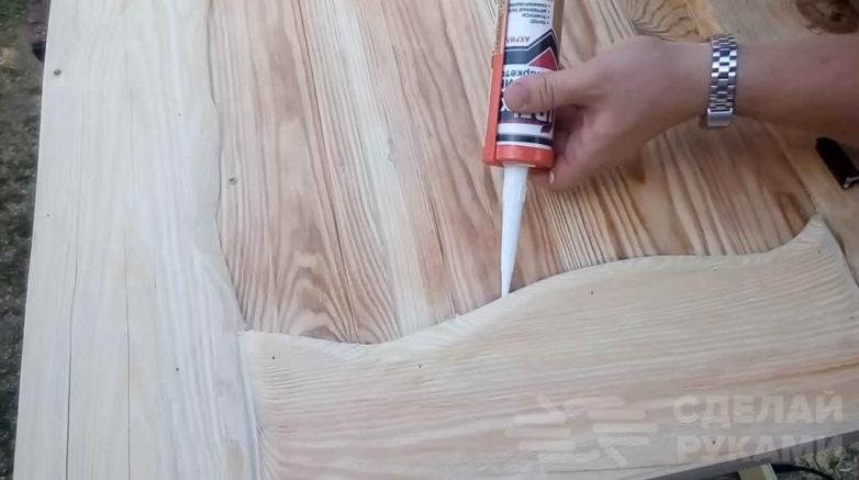 После высыхания пены поверхность двери и накладок нужно обработать, чтобы придать им более оригинальный внешний вид. Далее все стыки надо пройти герметиком. В результате получится уже «обновленное» дверное полотно.