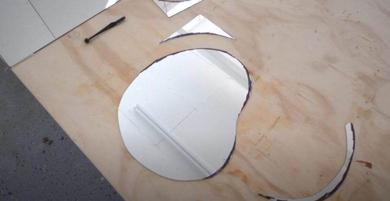 Первым делом нужно будет найти кусок зеркала, который мы будем резать на заготовки произвольной формы. Желательно чтобы зеркало было как можно тоньше — с ним легче работать. Резать будем при помощи стеклореза.После этого маркером рисуем на лицевой стороне зеркала нужную форму. Однако помните: чем сложнее рисунок, тем дольше вы будете его вырезать.