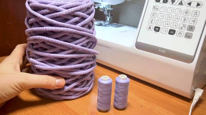 Отмерьте 70 см шнура 5 мм, сложите пополам. На машинке выставите зигзаг с шириной стежка от 4,5 мм до 6,5 мм, частота — 1,2 или 1,4 мм. Прошейте зигзагом, делая закрепки.