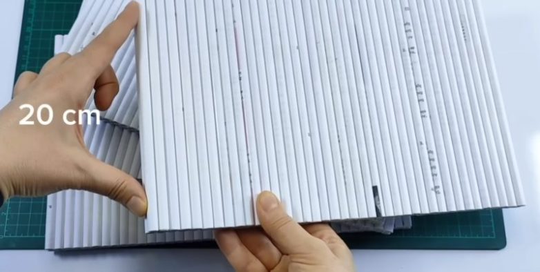 Соедините трубочки попарно, а затем соедините их между собой. Необходимо подготовить панели шириной по 32 см. Всего потребуется 7 таких панелей.