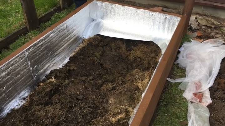Следом — слой скошенной травы. Обязательно пролейте грядку горячей водой. Доски внутри закройте подложкой. Тогда грядки будут действительно тёплыми, а доски дольше прослужат.