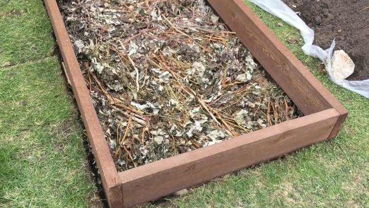 Смастерите короб из саморезов и досок. Размеры подгоняйте под собственные нужды. Установите короб. Сверху установите и закрепите такой же, чтобы была достаточная высота. Чтобы он не провалился, по углам можно заранее положить кирпичи. Поверх картона выложите ботву и тонкие ветки.