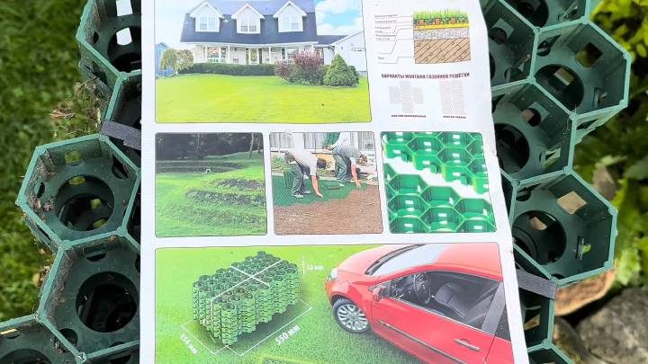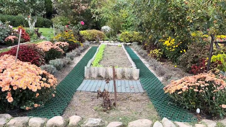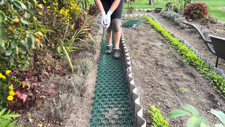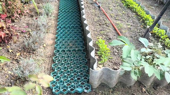 Нетривиальным решением для узких проходов между грядками станет газонная решётка. Трава в них не вытаптывается;, появляется высокая устойчивость к механическим нагрузкам.