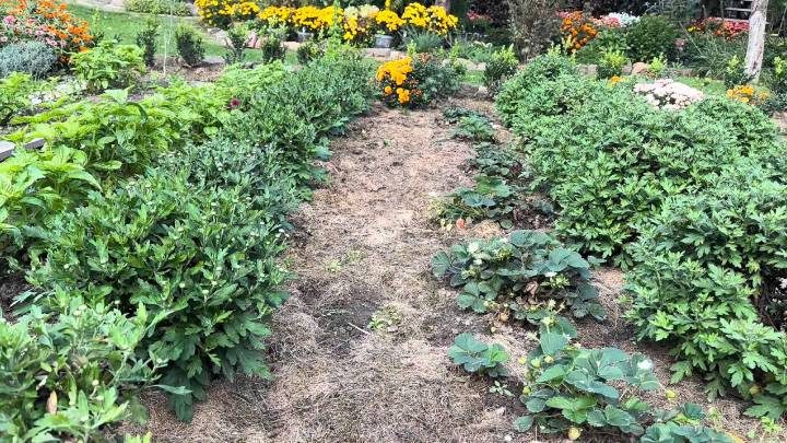 Скошенную траву можно уложить на клумбы и более узкие проходы между ними. Это и питание, и защита от вредителей, и естественное рыхление земли! Однако траву нужно постоянно добавлять.