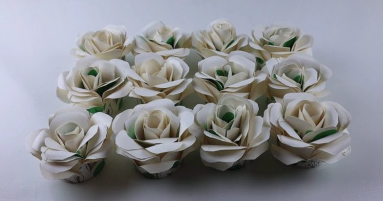 Бумажные розочки можно использовать для изготовления оригинального абажура. Чтобы сформировать абажур, к одной розе приклейте 5 других розочек, формируя полусферу.