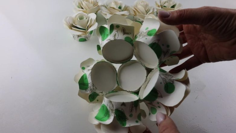 Каждую заготовку без дна скрутите спиралькой и приклеила к основанию розы.