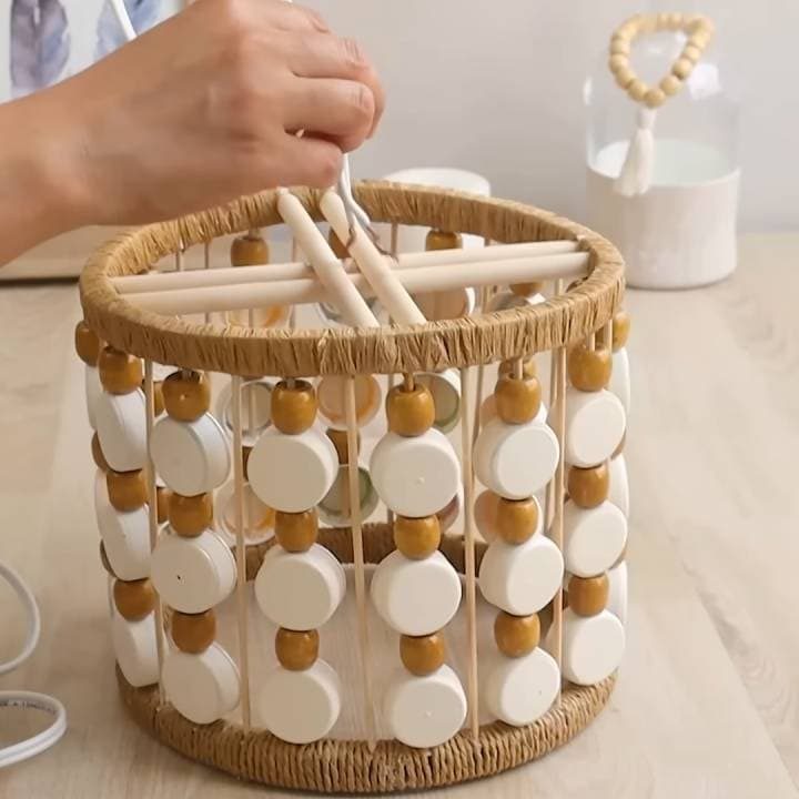 Сделайте чётное количество отверстий по краю ведра (в данном МК — 20 шт.). В каждое завяжите длинный отрез пряжи, сложенный вдвое. Собирайте по 6 отрезов вместе, перекручивайте и фиксируйте на дне клеем. Получится красивый узор!