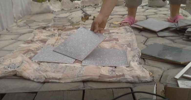 В данном случае мы будем использовать битую плитку. Чтобы получить осколки, стелим на пол покрывало, а сверху накладываем остатки керамической плитки.